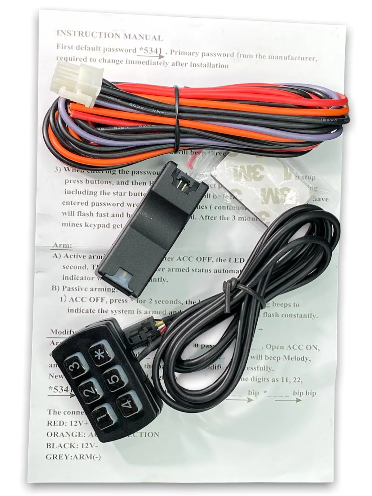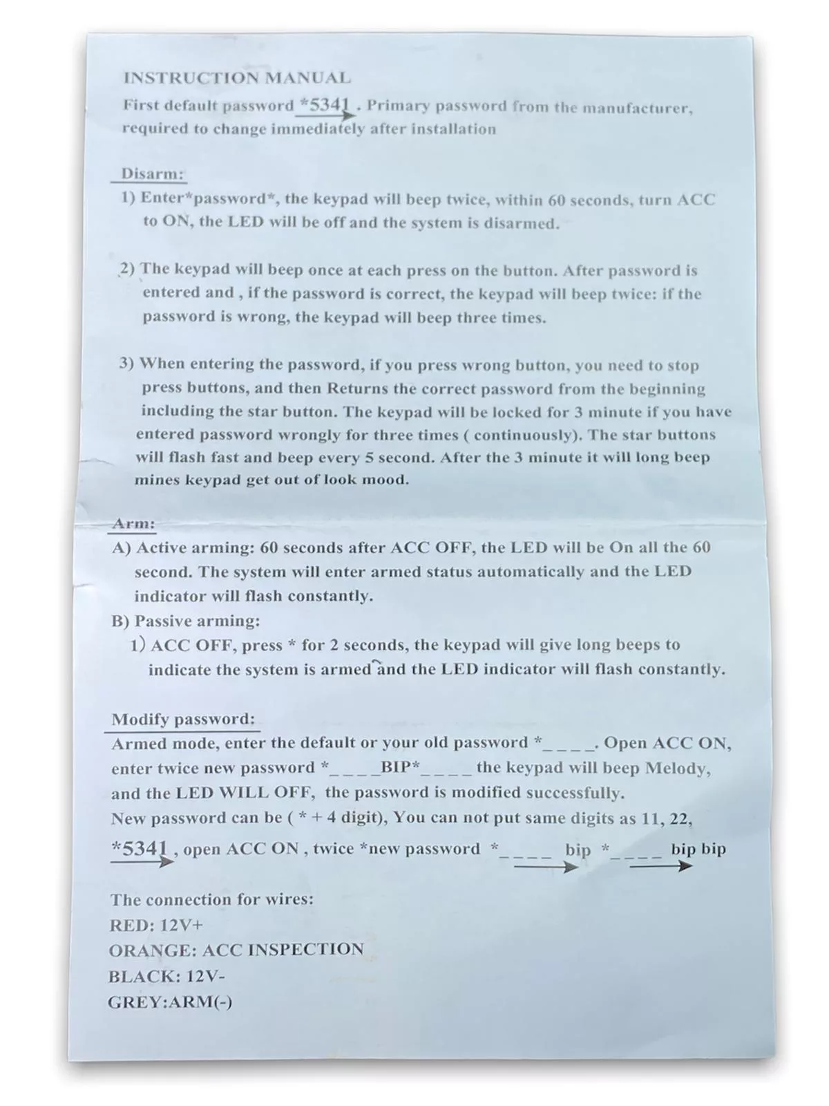 1? ACC OFF, press * for 2 seconds, the keypad will give long beeps to indicate the system is armed and the LED indicator will flash constantly.